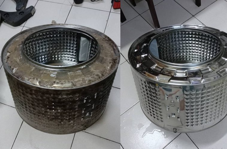 tháo lồng giặt và thùng chứa nước dùng vòi xịt áp lực cao và bàn chải đánh sạch cáu bẩn,